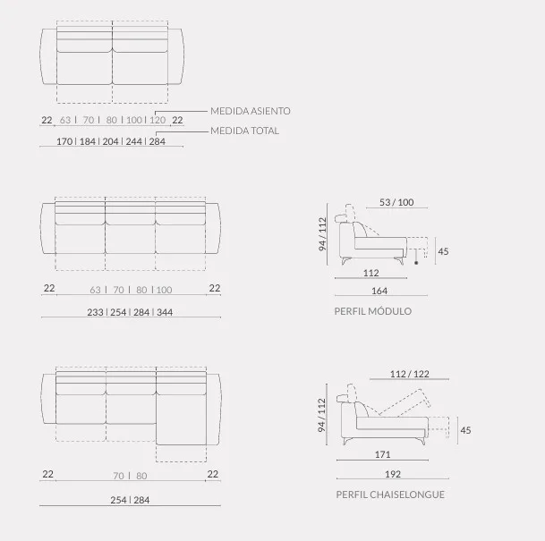 | Medidas | 2 plazas (170cm), 3 plazas (233 cm), 3 plazas (254 cm), 3 plazas (284cm), 3 plazas 2 asientos (184cm), 3 plazas 2 asientos (204cm), Chaiselonge (284x 171/192 cm), chaiselongue (254×171/192), lineal 2 asientos (244cm), lineal 2 asientos (284cm), lineal 3 asientos (344cm) |