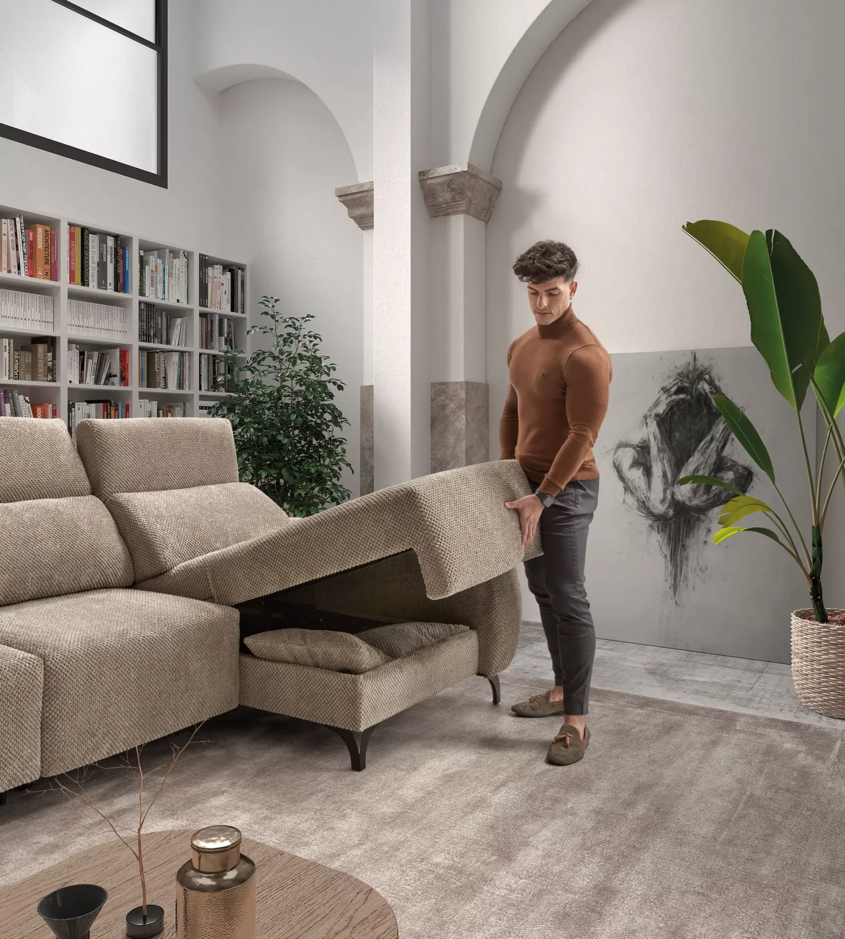 El módulo chaise longue es deslizante eléctrico e incluye arcón de almacenamiento. Las botoneras quedan discretamente situadas entre las almohadas del asiento, manteniendo una estética limpia. Existe opción de puerto USB disponible en el módulo rincón y en la parte superior del respaldo base del módulo sofá.